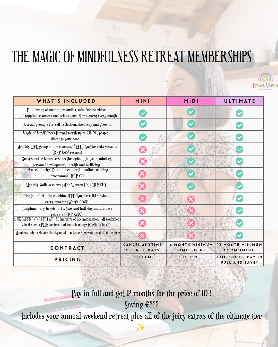 The Mini membership package at just £11 can be cancelled any time, and is a flexible membership. The Midi package is available at a minimum of 6 month commitment-as members get exceptional value. The Ultimate retreat membership is a minimum of 12 months, due to the SENSATIONAL value included- and to conform to the retreat T's and C's as all spaces are booked and paid for in advance of the retreat. Please see T's and C's for early termination fees. All memberships are non refundable, and set up on a monthly rolling basis for your ease and peace of mind.