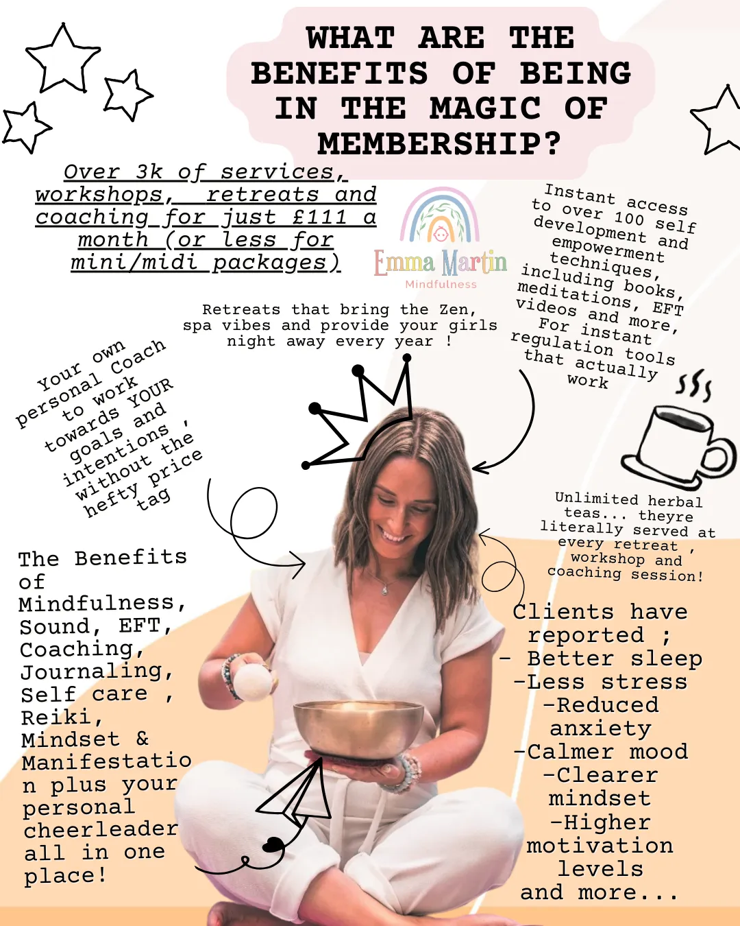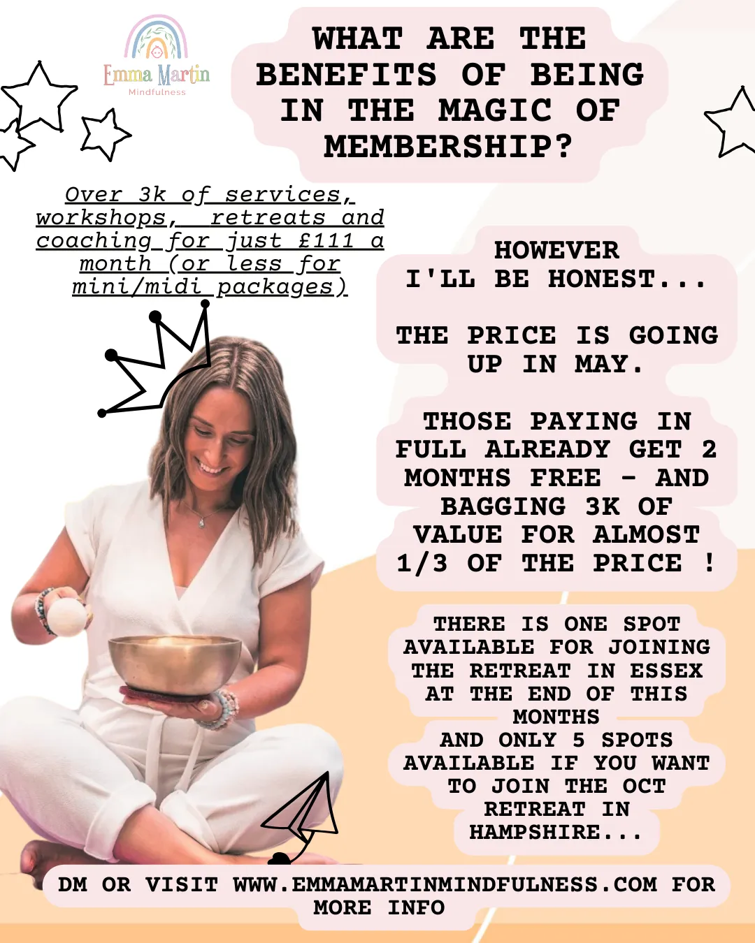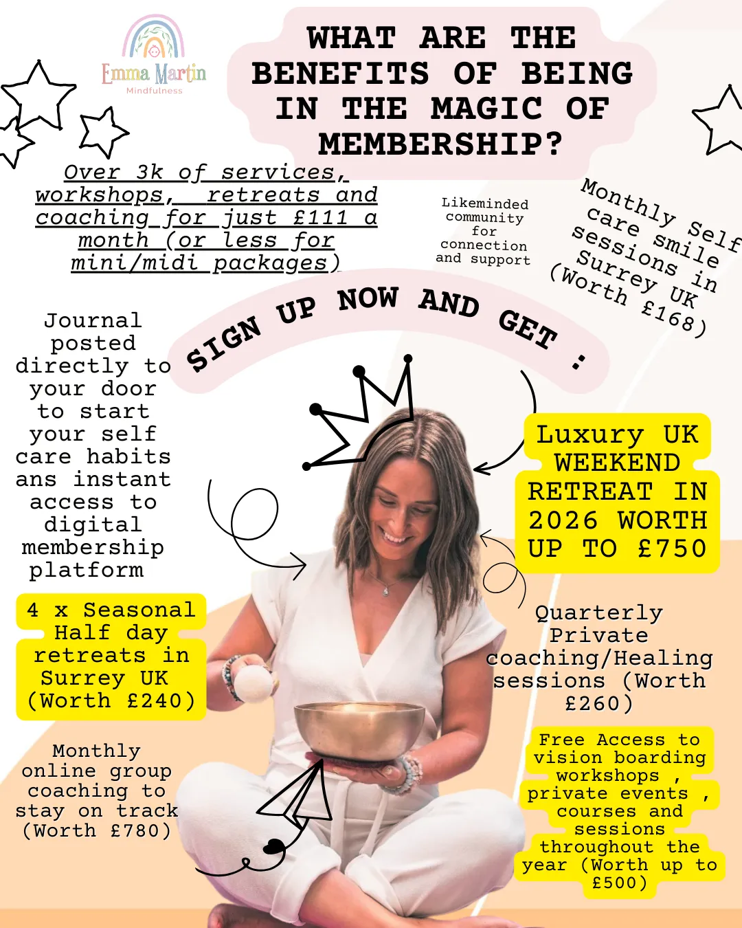 Enjoy a fully inclusive mindfulness retreat weekend in the UK, Private 1-2-1 coaching, monthly smile sessions, monthly group coaching, half day seasonal retreats every quarter, exclusive welcome gift , full access to the digital platform and more for just £111 a month! (Over £3000 worth of services- for less than half the price!)