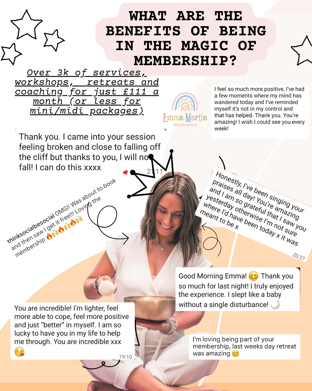 Benefit from exclusive group coaching sessions on zoom EVERY Month, get complimentary SMILE sessions, and reap the rewards of 1-2-1 intensive support from Emma, to meet your wellbeing goals.